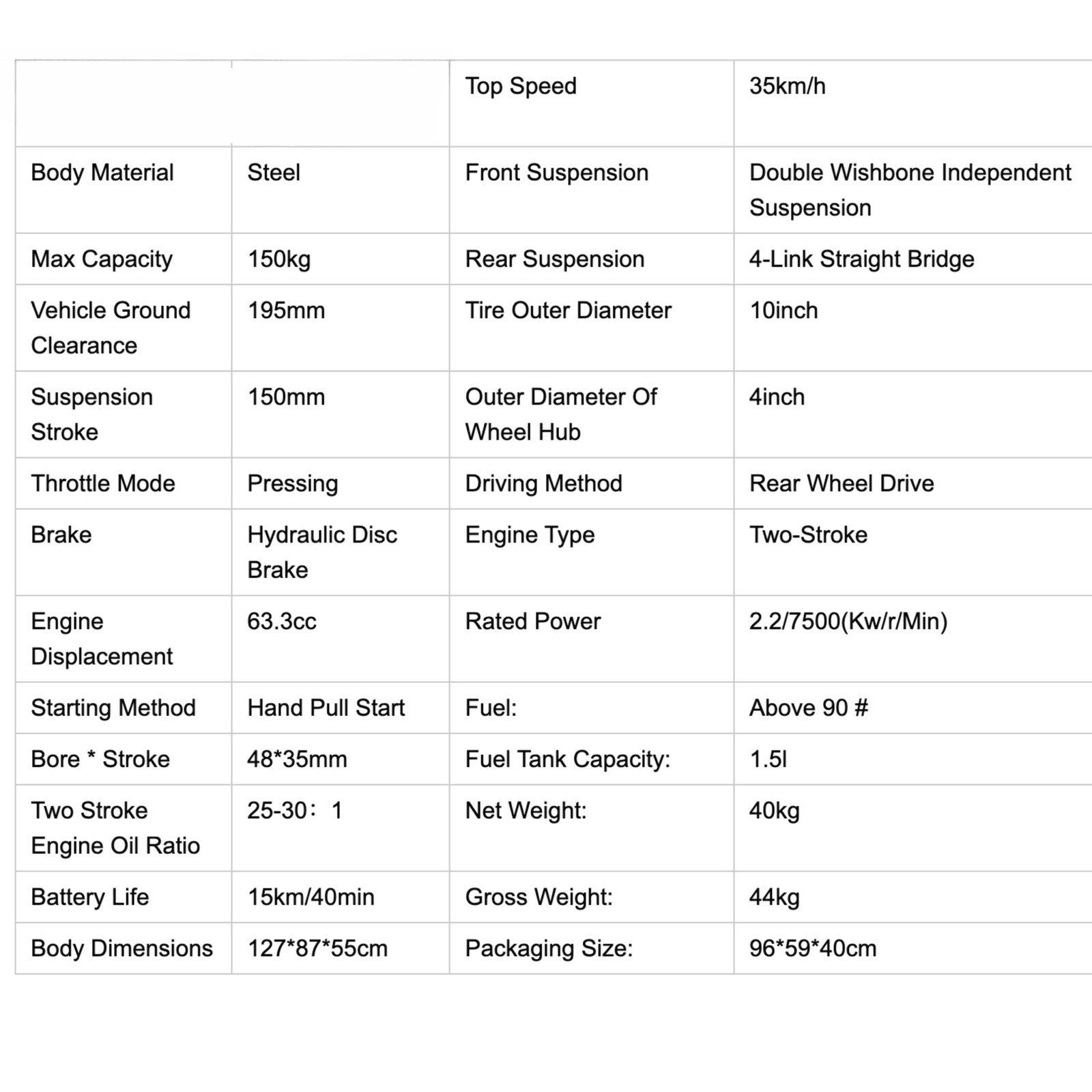 • Powerful Engine: 63cc gasoline engine delivers 2.4 kW of power for a safe yet exciting ride.