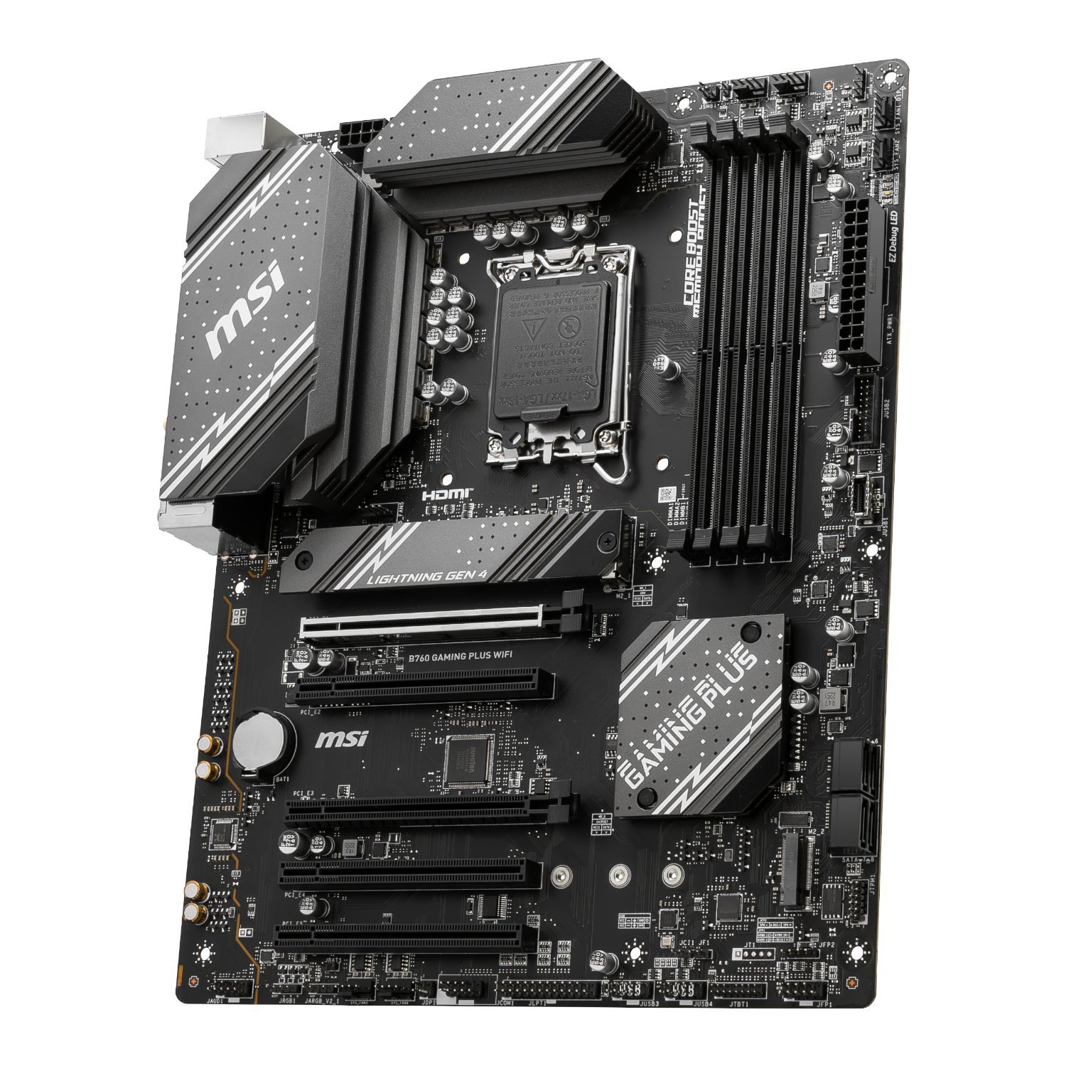 For gamers and content creators, the MSI B760 GAMING PLUS WIFI offers cutting-edge storage and connectivity options. With dual PCIe 4.0 M.2 slots featuring M.2 Shield Frozr, users can enjoy ultra-fast storage speeds that significantly reduce game load times. The inclusion of Turbo USB 3.2 Gen 2 ensures rapid data transfer, while 2.5G LAN and Intel® Wi-Fi 6E provide seamless, low-latency networking. With multiple USB ports, HDMI, and DisplayPort support, this motherboard is built to accommodate a wide range of peripherals and high-resolution displays for a next-level gaming and productivity experience.